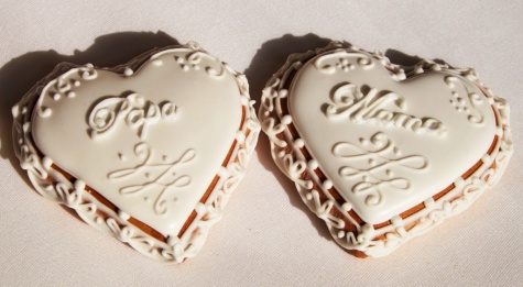 Wunderschöne Herz mit aufwändiger Randverzierung. Grundfarbe für Zuckerguss und Beschriftung: weiß.