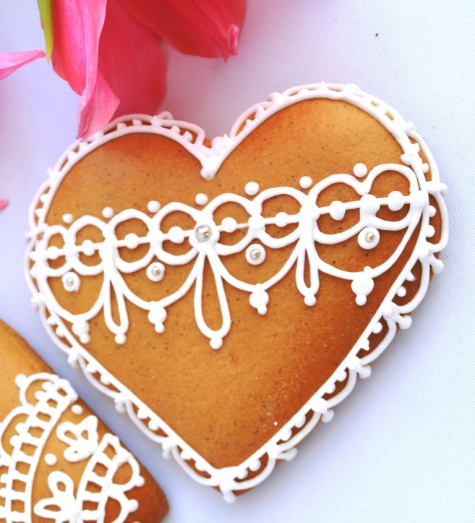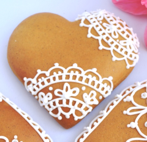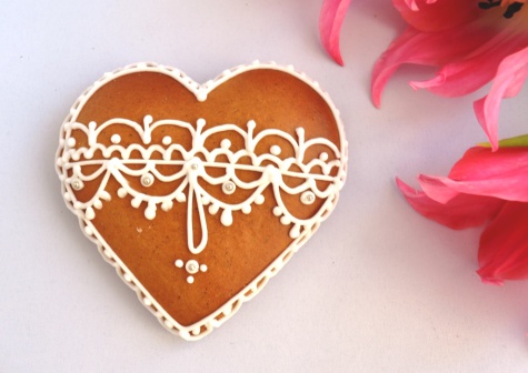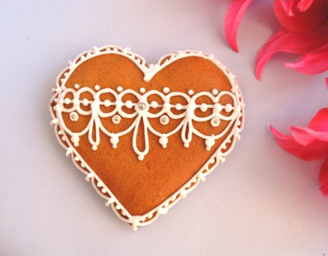 Diese Lebkuchenherzen sind schlicht natur-braun gehalten. Mit der aufwändigen weißen Verziehrung bekommt man jedoch ein sehr edles, elegantes Platzkärtchen.